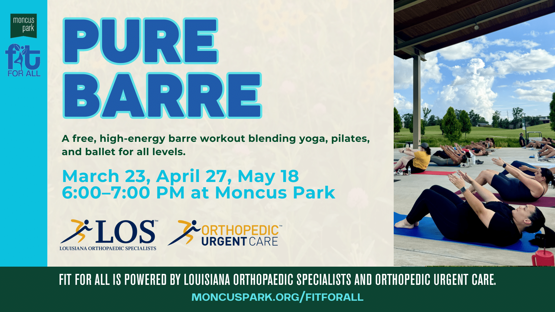 Pure Barre is popping up at Moncus Park for a special outdoor workout as part of the Fit For All fitness series. This free class blends elements of yoga, pilates, and ballet into a low-impact, full-body workout that’s energizing, approachable, and easy to modify.
