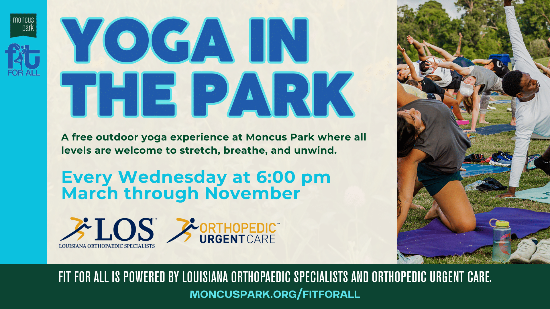 Transform your Wednesday evenings with Yoga in the Park at Moncus Park, part of the “Fit For All” series presented by Louisiana Orthopaedic Specialists & Orthopedic Urgent Care.